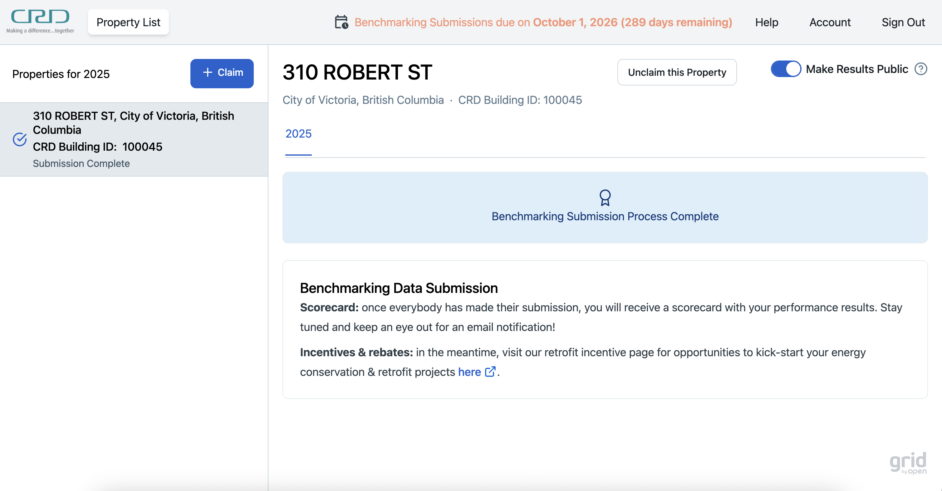 To complete benchmarking for a property for the CRD Building Benchmarking Program, you must first ‘claim’ the property on the Building Owner Portal. By claiming a property you become the main point of contact (‘Data Contact’) for the claimed property ...