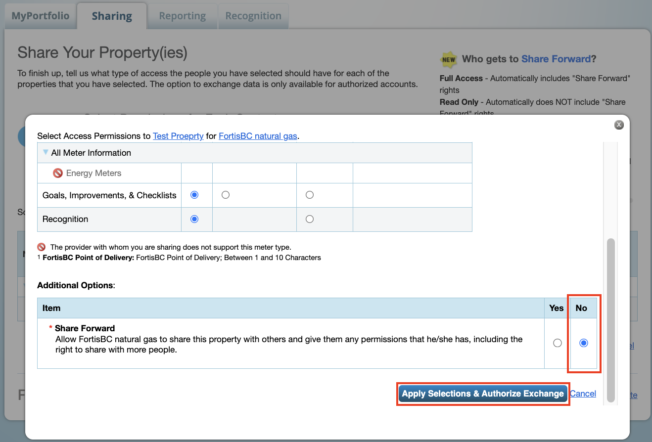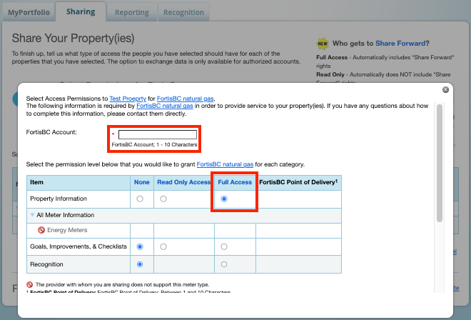 - Select "full access" sharing to your meters. Meters with "read-only" permissions will not be accepted by FortisBC