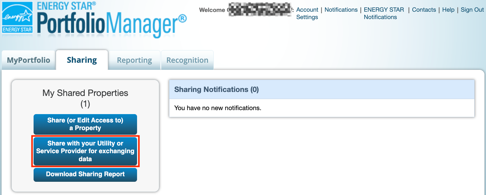 - In the Sharing tab, click 'Share with your Utility or Service Provider for exchanging data'