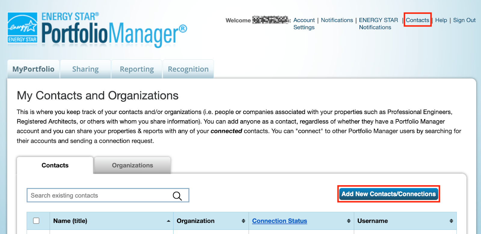 STEP 2 - To set up a natural gas meter sync, you must connect with FortisBC as a contact. Click on the ‘Contacts link’ at the top right hand corner of the page, which takes you to your My Contacts list. Then, click ‘Add New Contacts/Connections’.