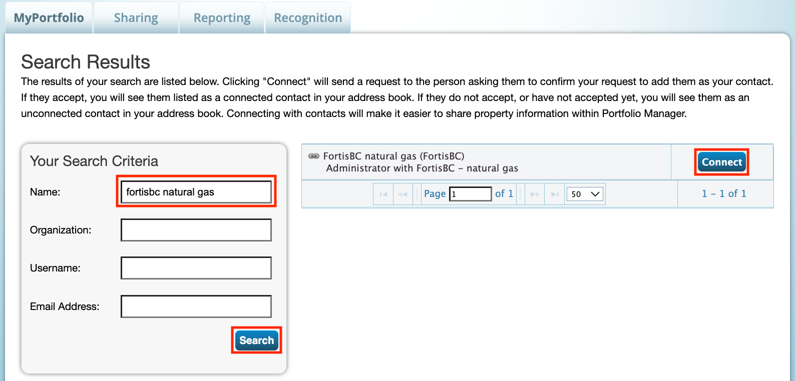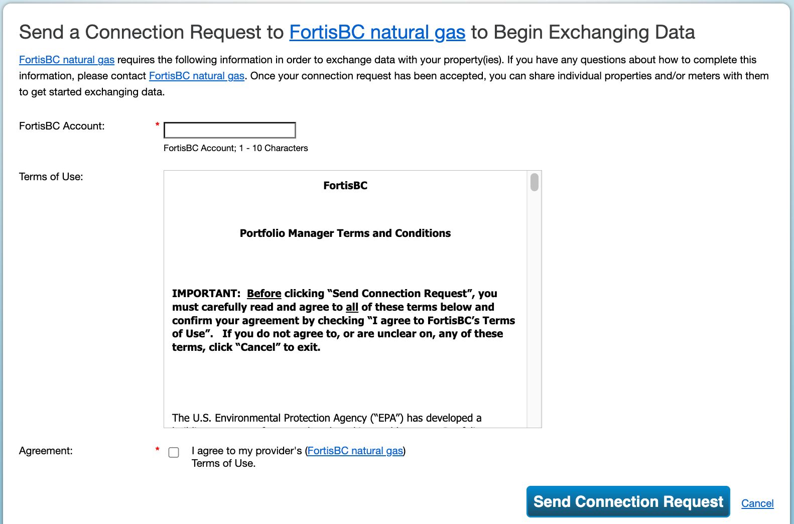 Note: You are not yet connected to FortisBC until your request is accepted. You will receive a notification in Portfolio Manager when FortisBC accepts your request. This process takes up to 24 hours.