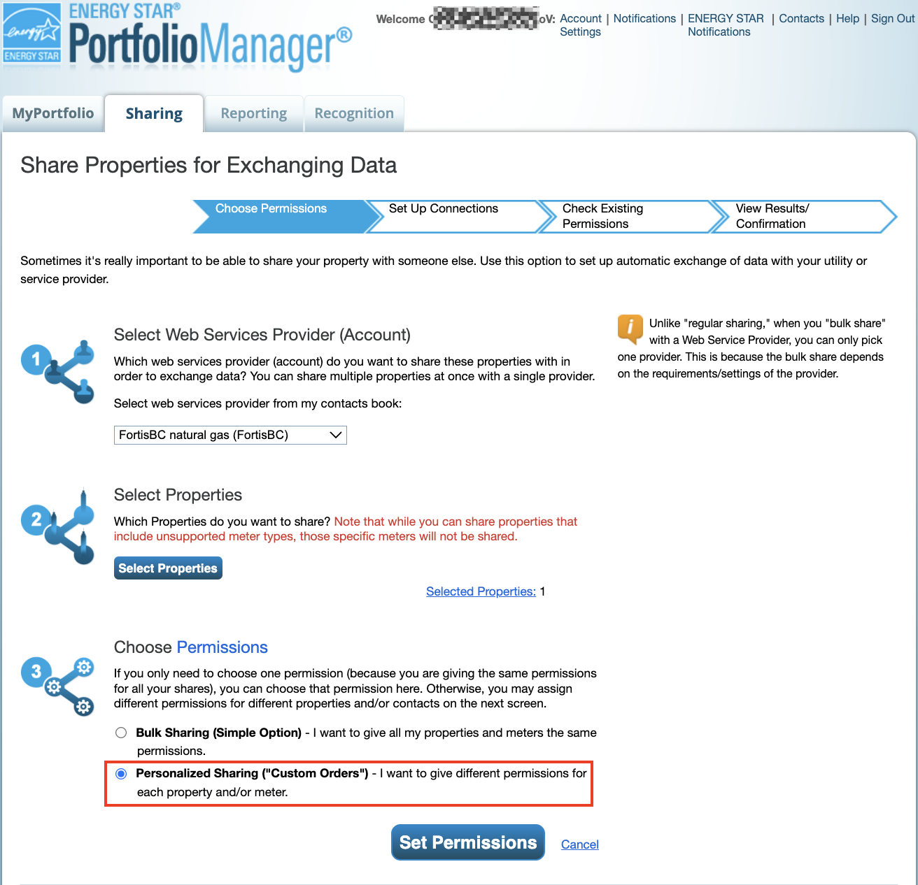 STEP 4 - After the connection with FortisBC is accepted, go to the Sharing tab in Portfolio Manager to select the properties and natural gas meters you want data uploaded for. This is where you’ll set up custom permissions and sharing, and validate each meter with your FortisBC account number(s), last bill date and amount.
