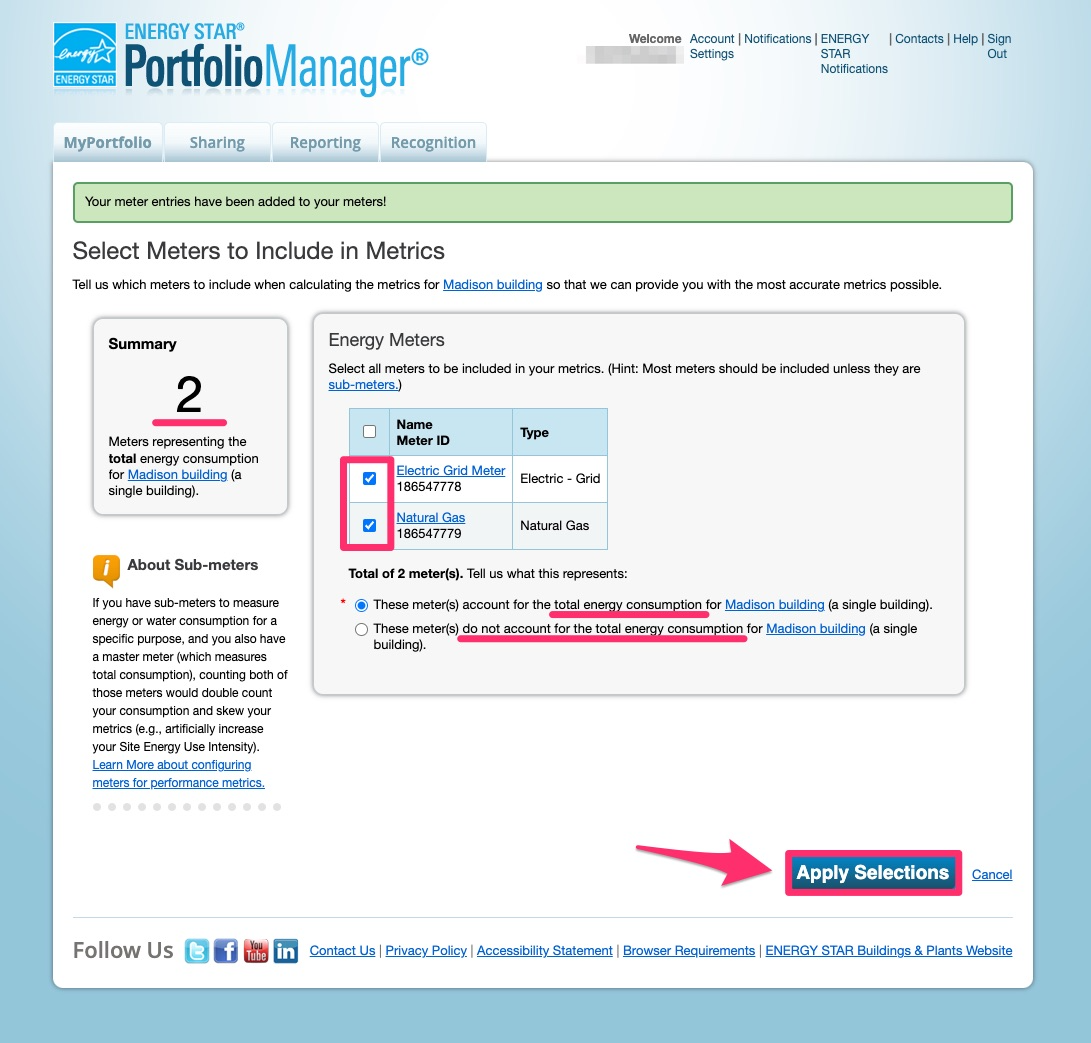 STEP 2 - Select which meters to include for your property and confirm if these meters represent the total energy usage of your property, or only represent the partial energy usage of the building.