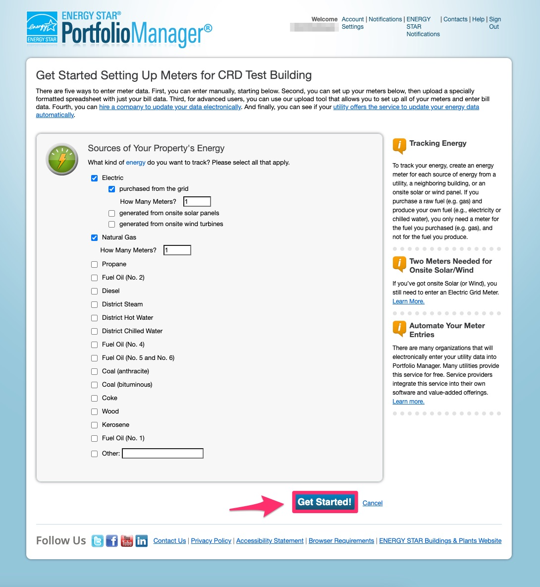 STEP 2 - Select the type(s) of meter(s) (Electric or Gas, etc.), the energy source (Purchased from the grid or generated onsite) and enter the number of meters for each energy type. If your building has any energy meters managed by tenants, be sure to add these meters as well. If your building uses Renewable Natural Gas, please add a “Natural Gas” meter to your property, then refer to STEP 4 below. After adding this information, click ‘Get Started’.
