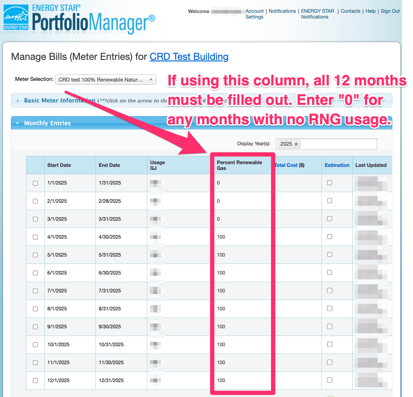 If the meter switched to Renewable Natural Gas partway through the year, you can indicate this by entering “0” in the “Percent Renewable Gas” column for the months preceding the switch to Renewable Gas, as illustrated in the screenshot below: