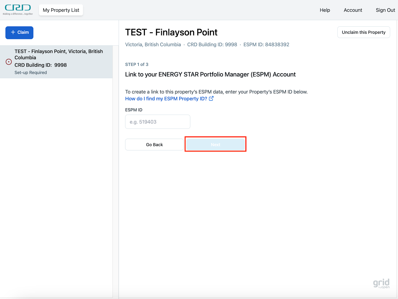 this article on how to find your property's ESPM ID) and click 'Next'.
