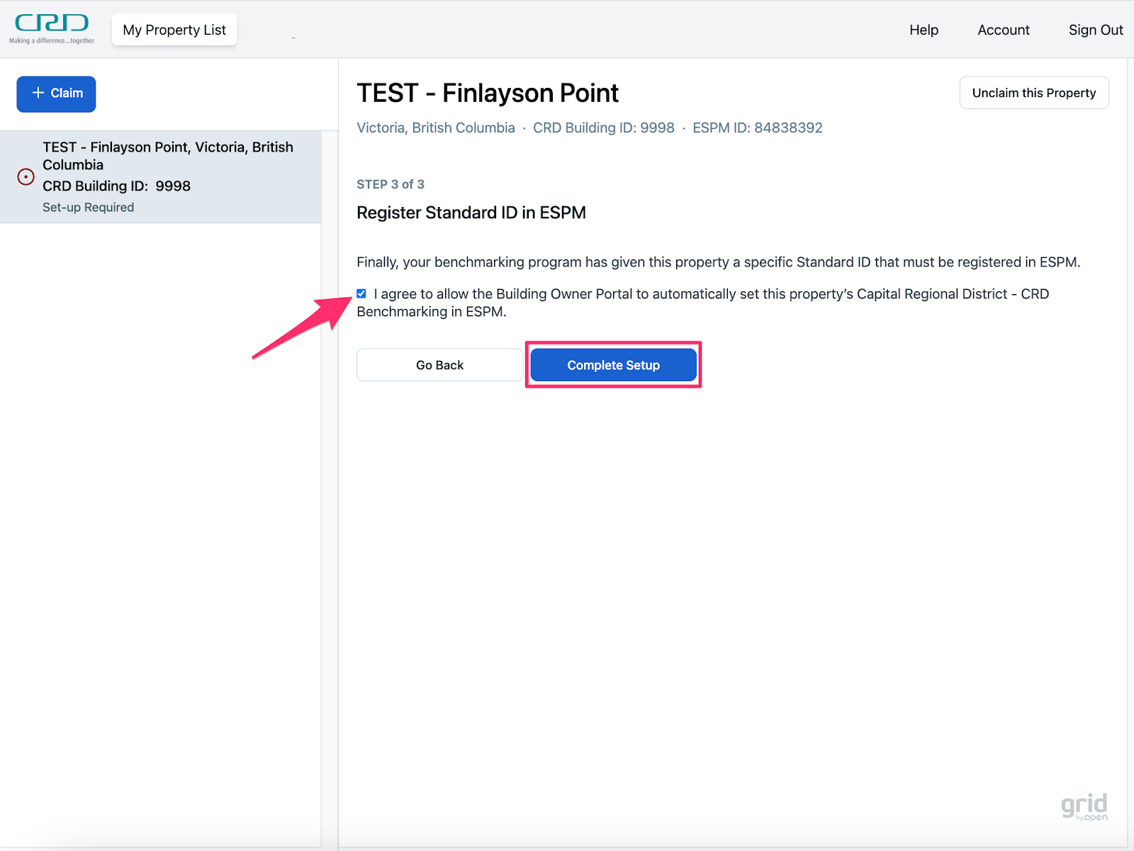 If you have shared the property on ESPM with Full Access rights, you will be able to apply the CRD Building ID to your ESPM property from the Building Owner Portal. Click the checkbox "I agree to allow the Building Owner Portal to automatically set this property’s Capital Regional District - CRD Benchmarking in ESPM" and then click 'Complete Setup'.