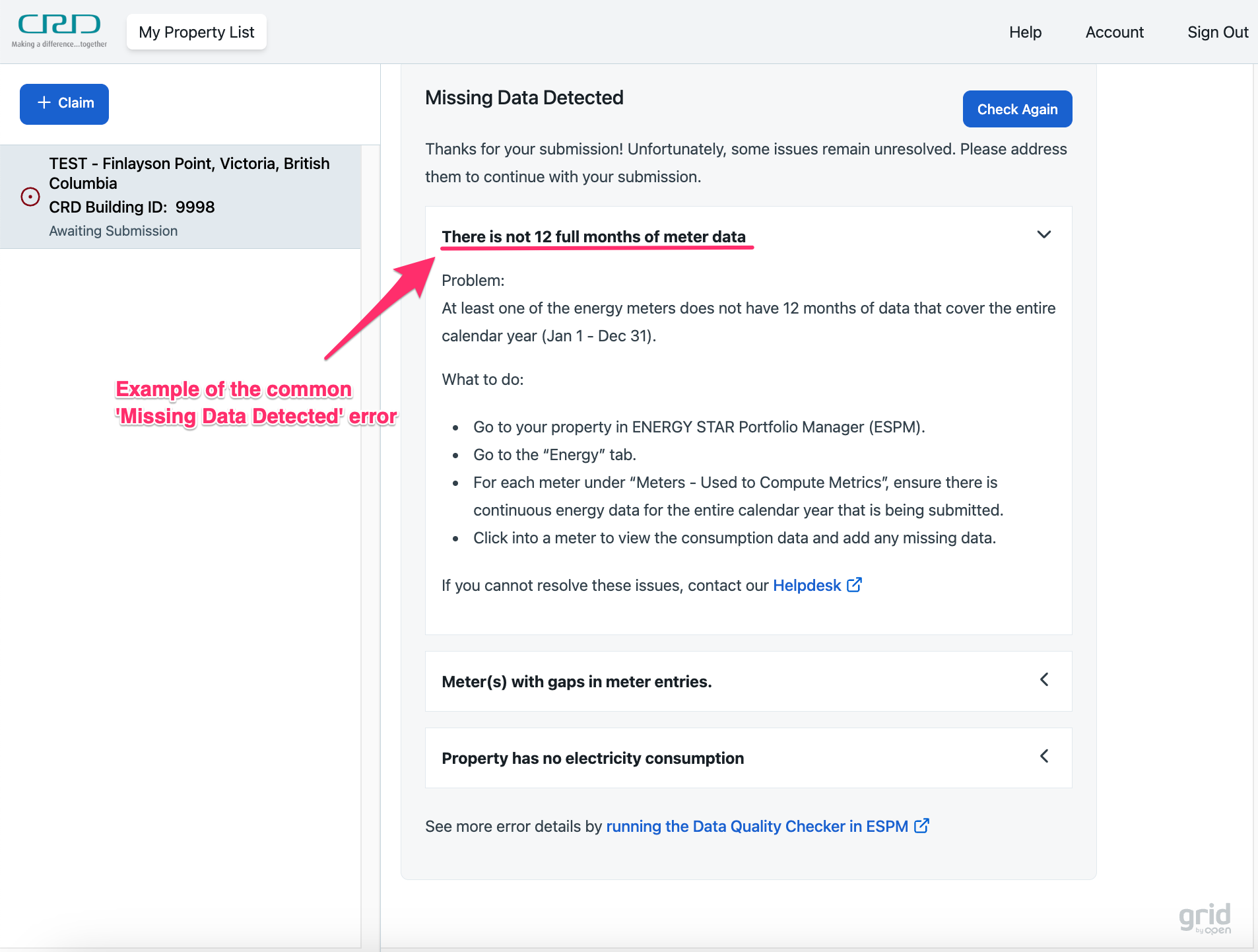 If errors are detected, you will receive an error message. Go to ESPM and correct the data errors, before clicking 'Check Again'. You will not be able to submit your building's benchmarking data to the CRD Building Benchmarking Program without completing this step.