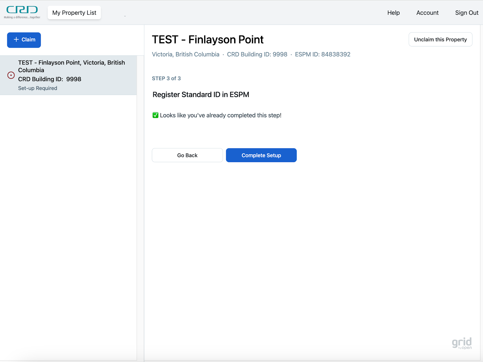 If you have already added your CRD Building ID to your property in ESPM, the message below will appear. Click 'Complete Setup' to move to the next step.