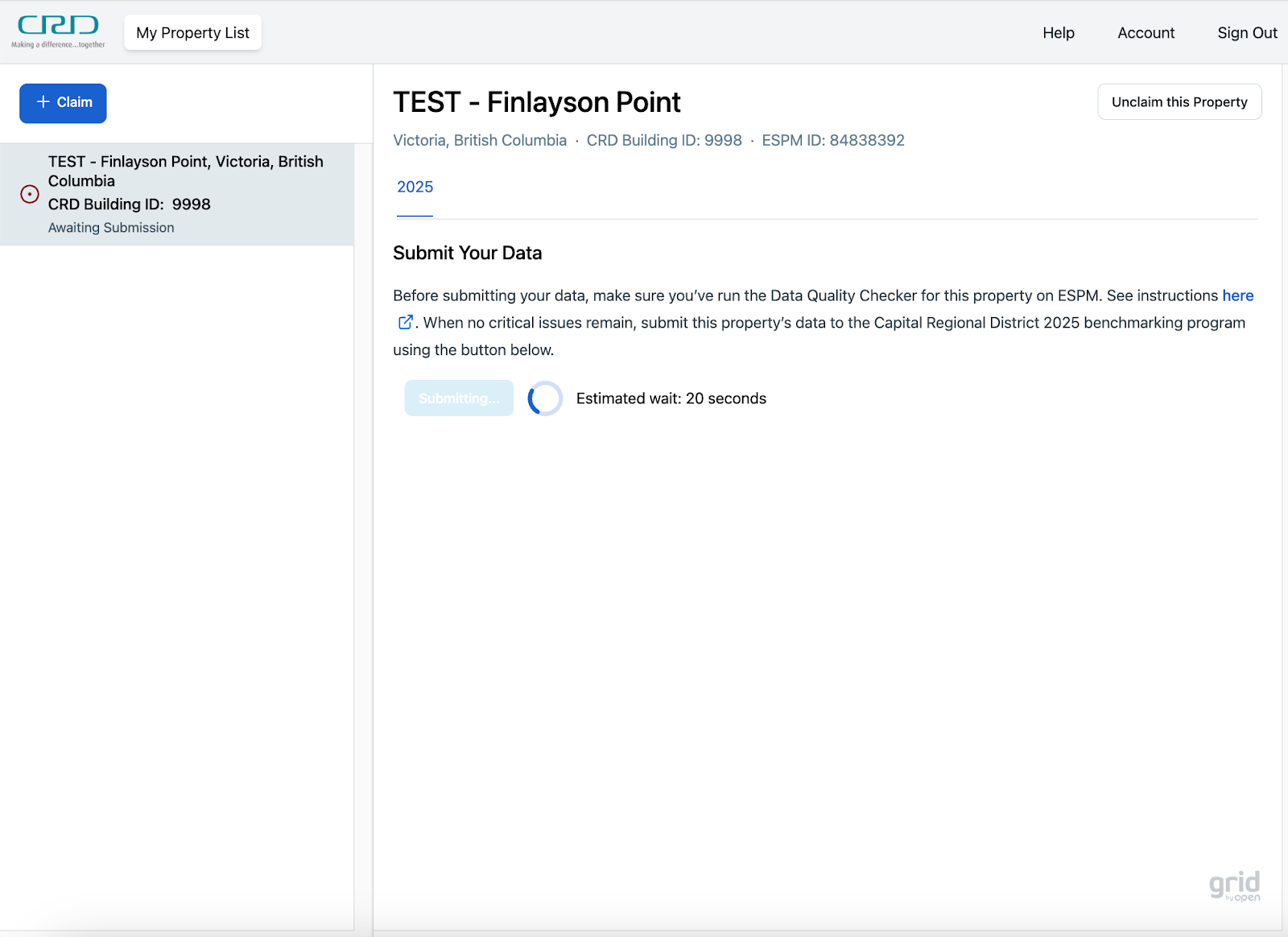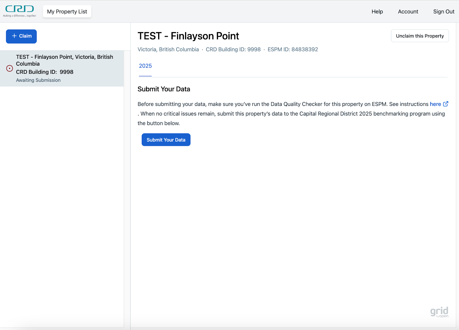 STEP 5 - Click ‘Submit Your Data’ to submit your property to the CRD Building Benchmarking Program. This will launch the Data Quality Checker to check that your property data is complete before you can finish the submission process.