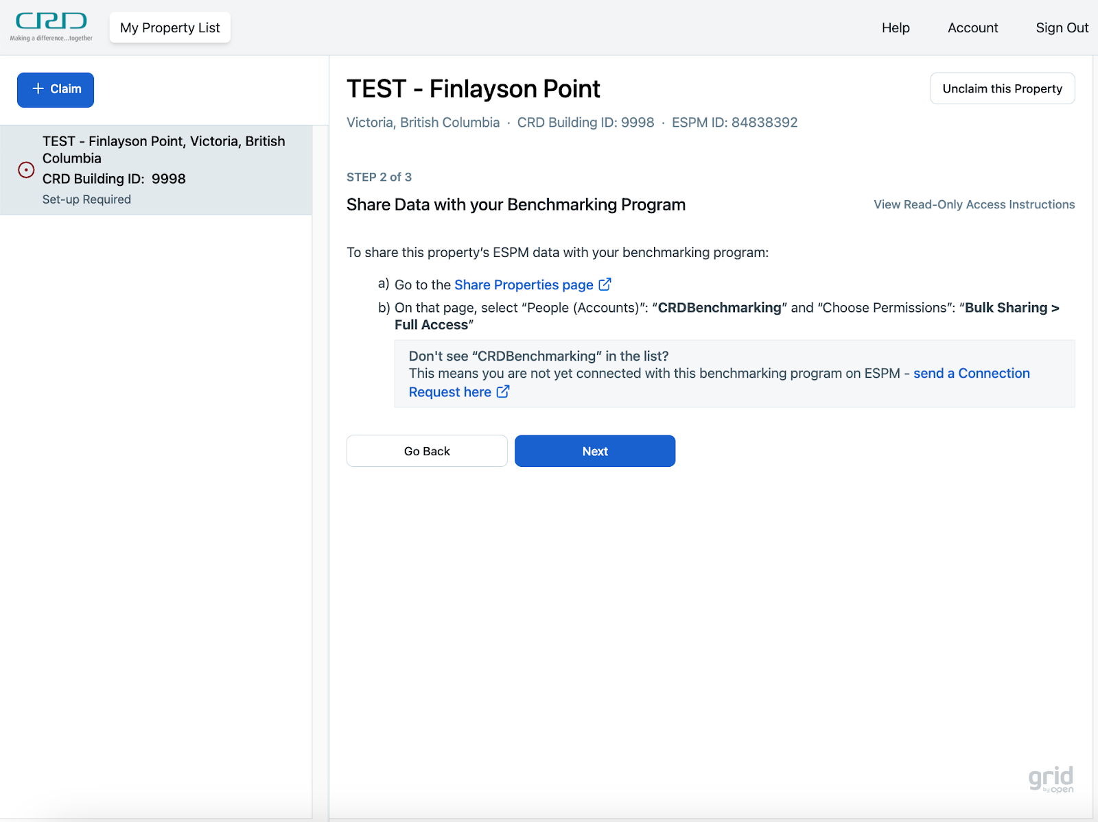 STEP 3 - Confirm that you have shared your property on ESPM with CRDBenchmarking. If not, follow the instructions and links in the Building Owner Portal to share access to your properties. For help, review the article "
