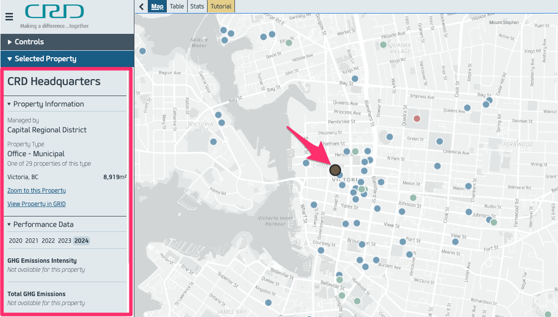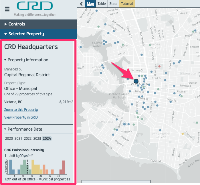 If your building has opted-in to the CRD Building Benchmarking Program map, the map will display your building’s name, building address, year built, management organization, property type, square footage, and the following building performance metrics for the current reporting year: